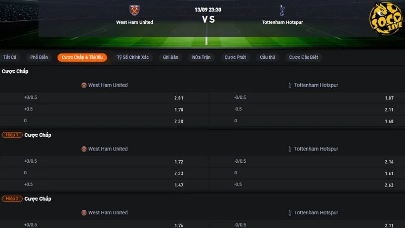 Bảng tỷ lệ kèo trận West Ham vs Tottenham
